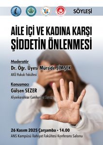 Aile içinde sevginin ve iletişimin yerini şiddete bıraktığı bir dünyaya dönüşmemek için toplumun tüm kesimlerinde şiddeti önlemenin öneminin farkındayız. Bu farkındalığı yaygınlaştırmak ve el ele vererek sorunun çözümünü kolaylaştırmak amacıyla 25 Kasım Dünya Kadına Karşı Şiddetle Mücadele günü münasebetiyle AKÜ Hukuk Fakültesi Dr. Öğr. Üyesi Mürşide ŞİMŞEK moderatörlüğünde Afyonkarahisar Cumhuriyet Savcısı Gülşen SEZER ile “Aile İçi ve Kadına Karşı Şiddetin Önlenmesi” konulu söyleşi düzenlenecektir.