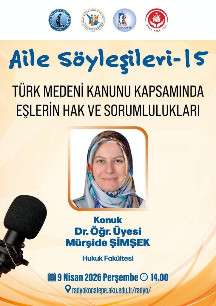 9 Nisan 2026 tarihinde Radyo Programına Hukuk Fakültesi öğretim üyesi Dr. Mürşide Şimşek konuk olacak. “Türk Medeni Kanunu Kapsamında Eşlerin Hak ve Sorumlulukları” konusunda gerçekleştirilecek programda saat 14.00’da Radyo Kocatepe’de.